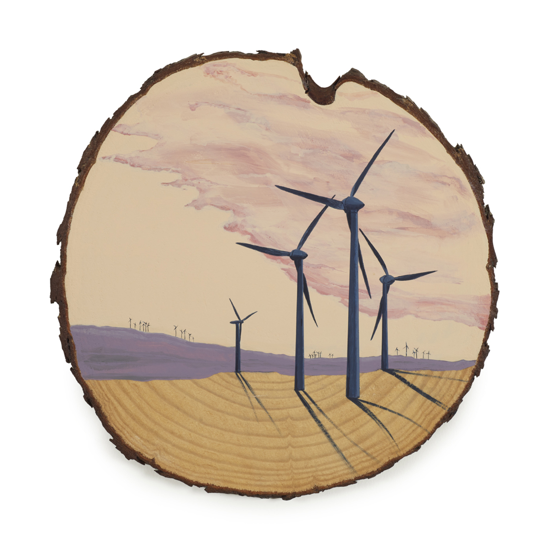 The wood slice paintings are reminiscent of souvenirs travelers once purchased as mementos of their road trips. These “souvenir” portraits document life in rural California. They depict the agricultural, industrial and recreational landscape, as well as the wildlife whose habitats shrink as this landscape changes. The narrative that runs through these paintings is the story of my community.