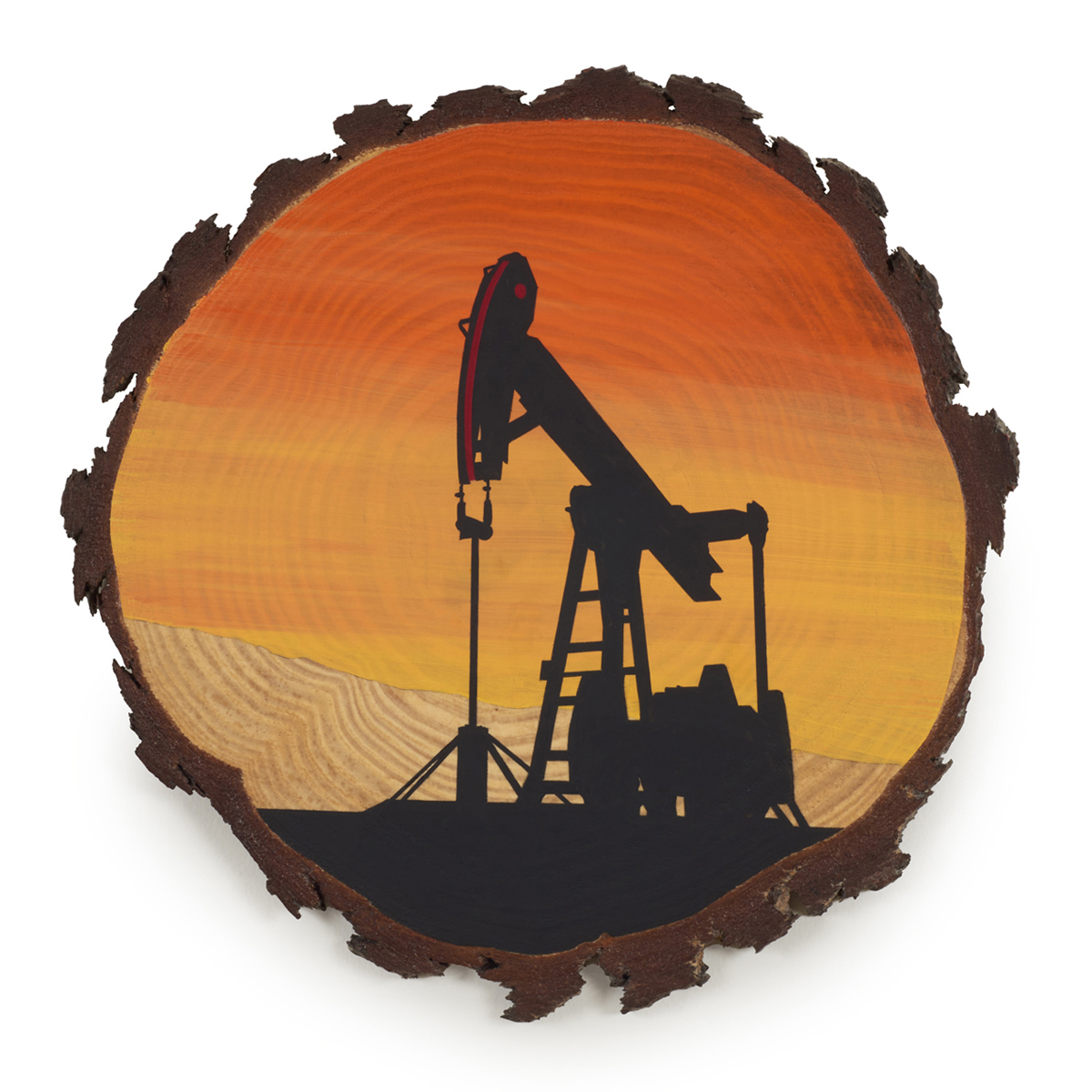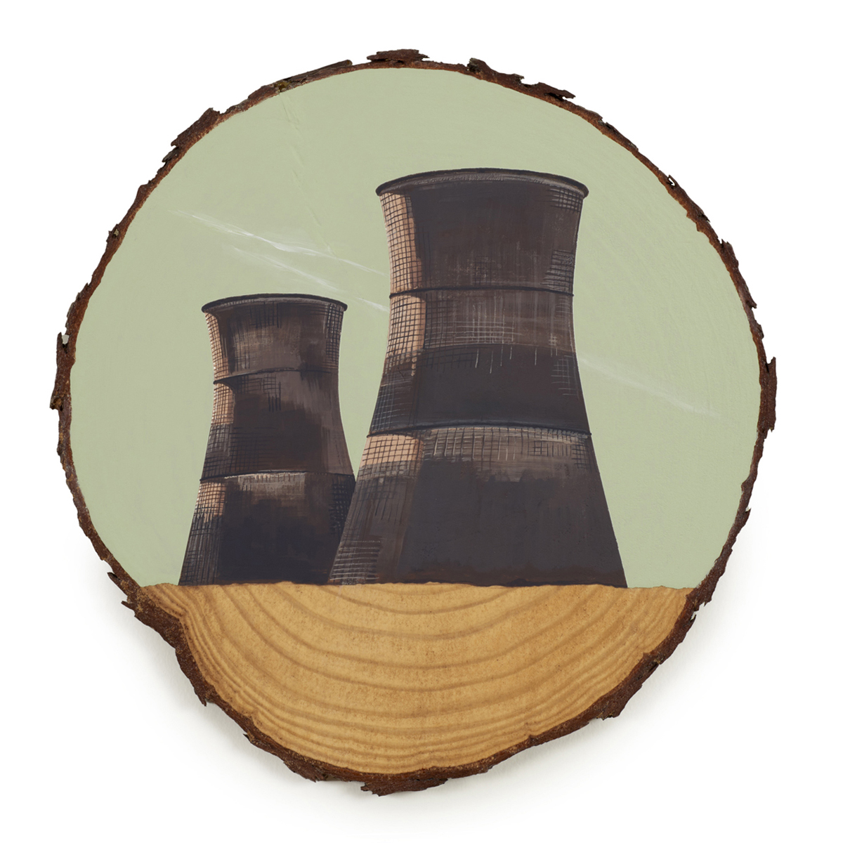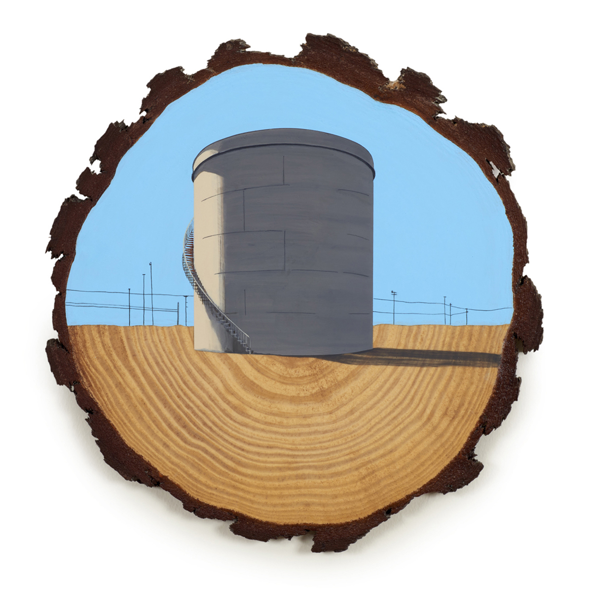 The wood slice paintings are reminiscent of souvenirs travelers once purchased as mementos of their road trips. These “souvenir” portraits document life in rural California. They depict the agricultural, industrial and recreational landscape, as well as the wildlife whose habitats shrink as this landscape changes. The narrative that runs through these paintings is the story of my community.
