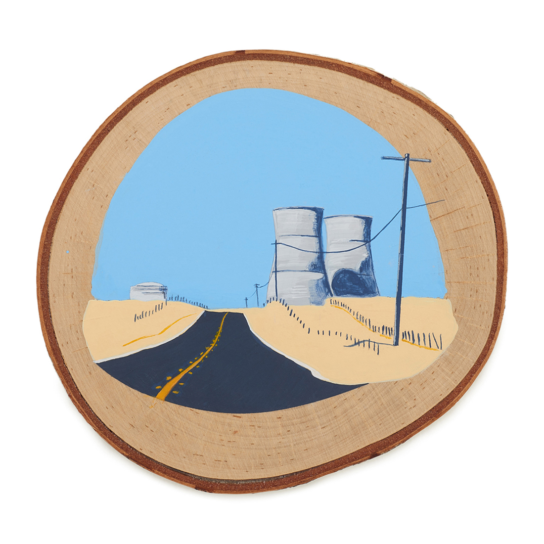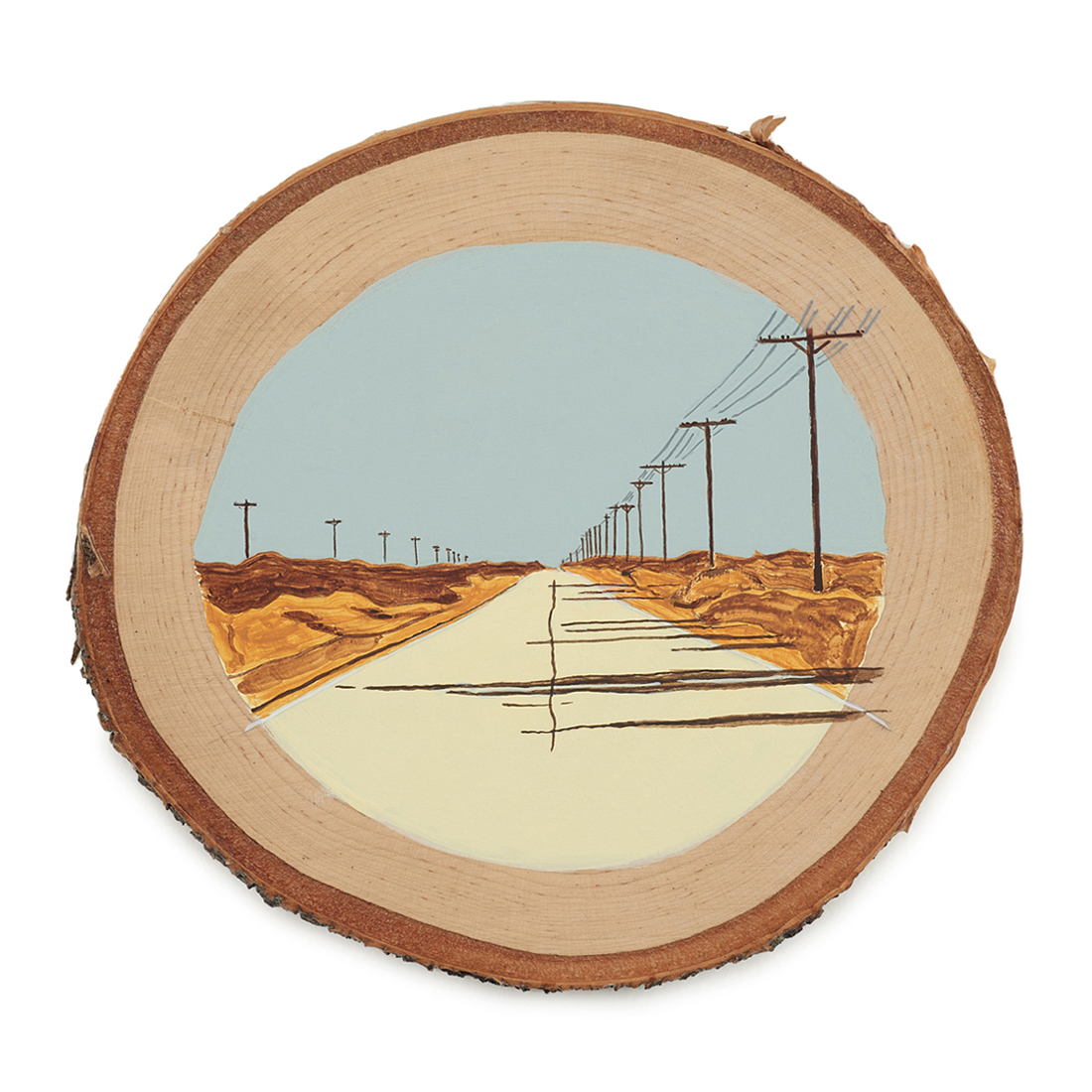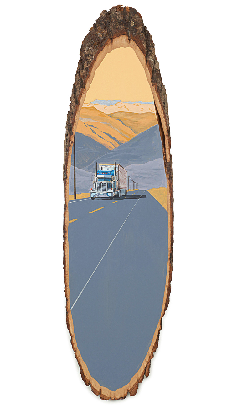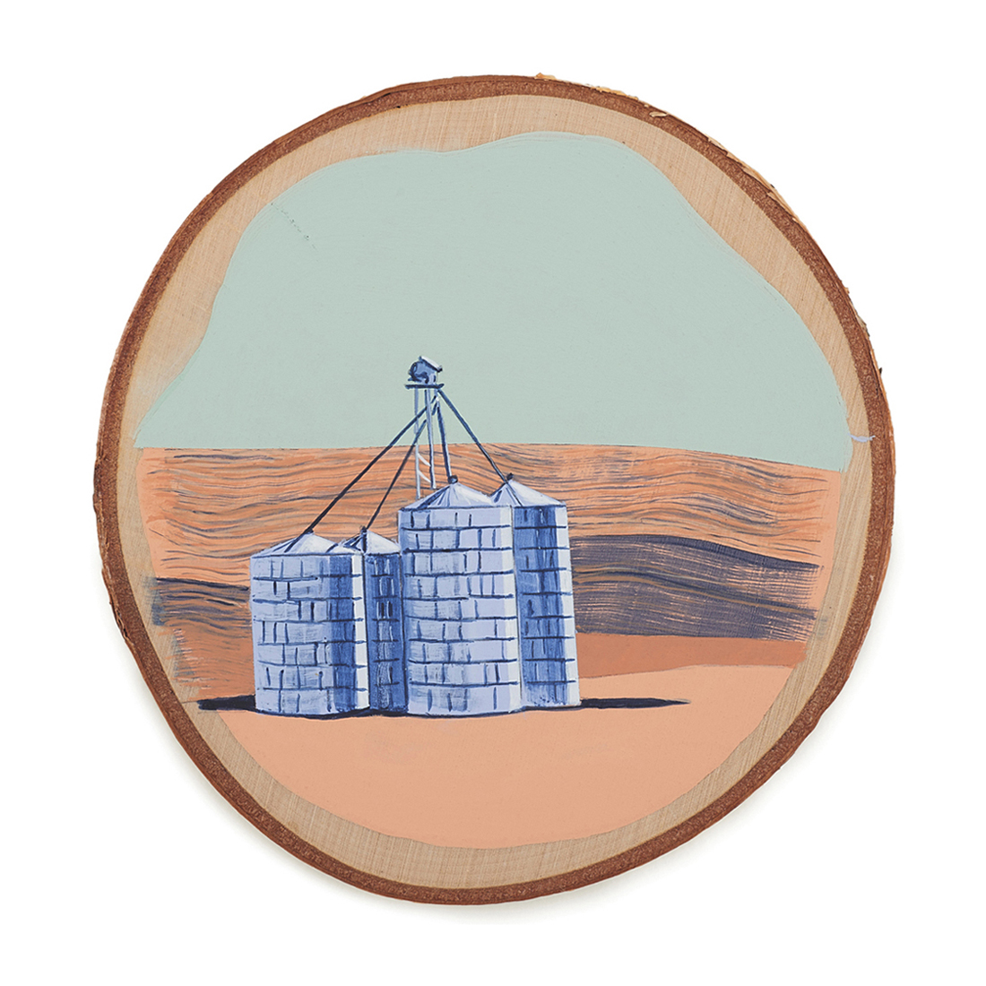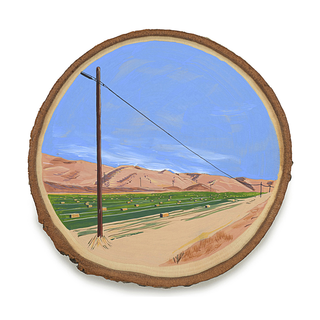 The wood slice paintings are reminiscent of souvenirs travelers once purchased as mementos of their road trips. These “souvenir” portraits document life in rural California. They depict the agricultural, industrial and recreational landscape, as well as the wildlife whose habitats shrink as this landscape changes. The narrative that runs through these paintings is the story of my community.