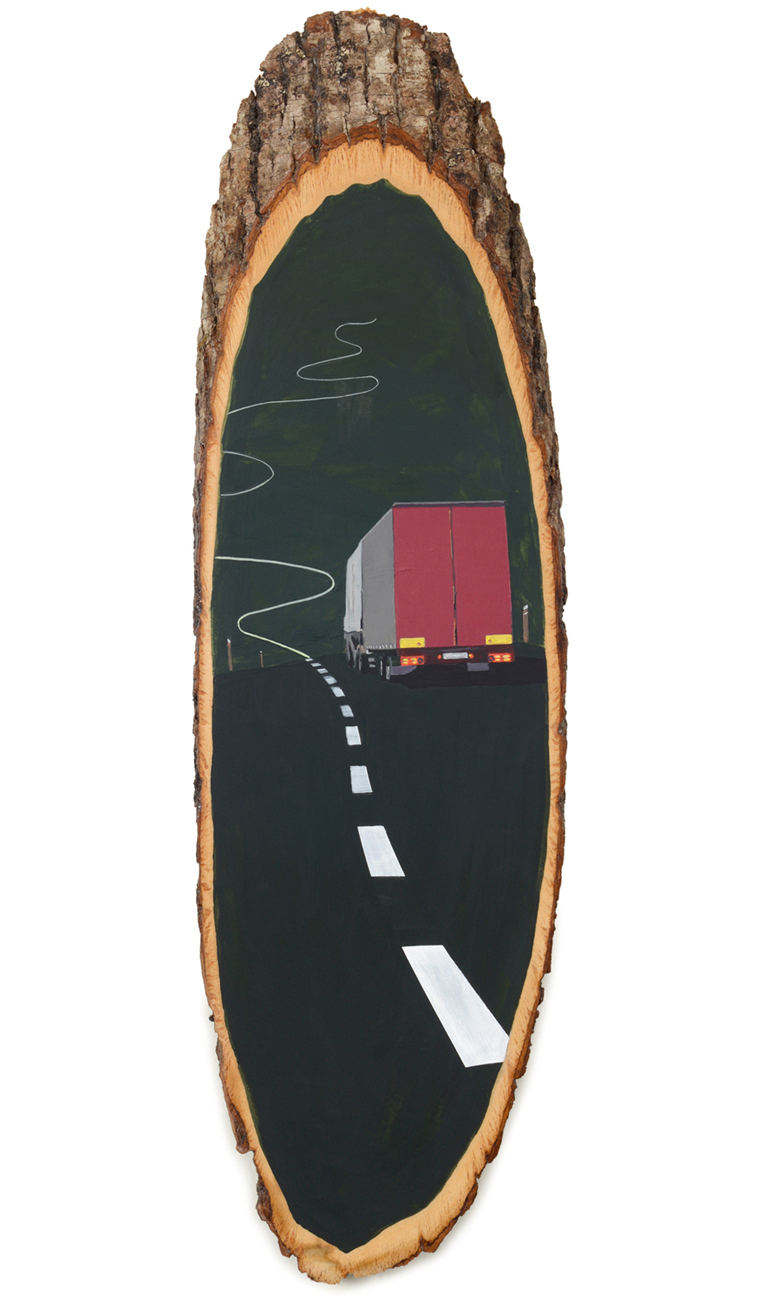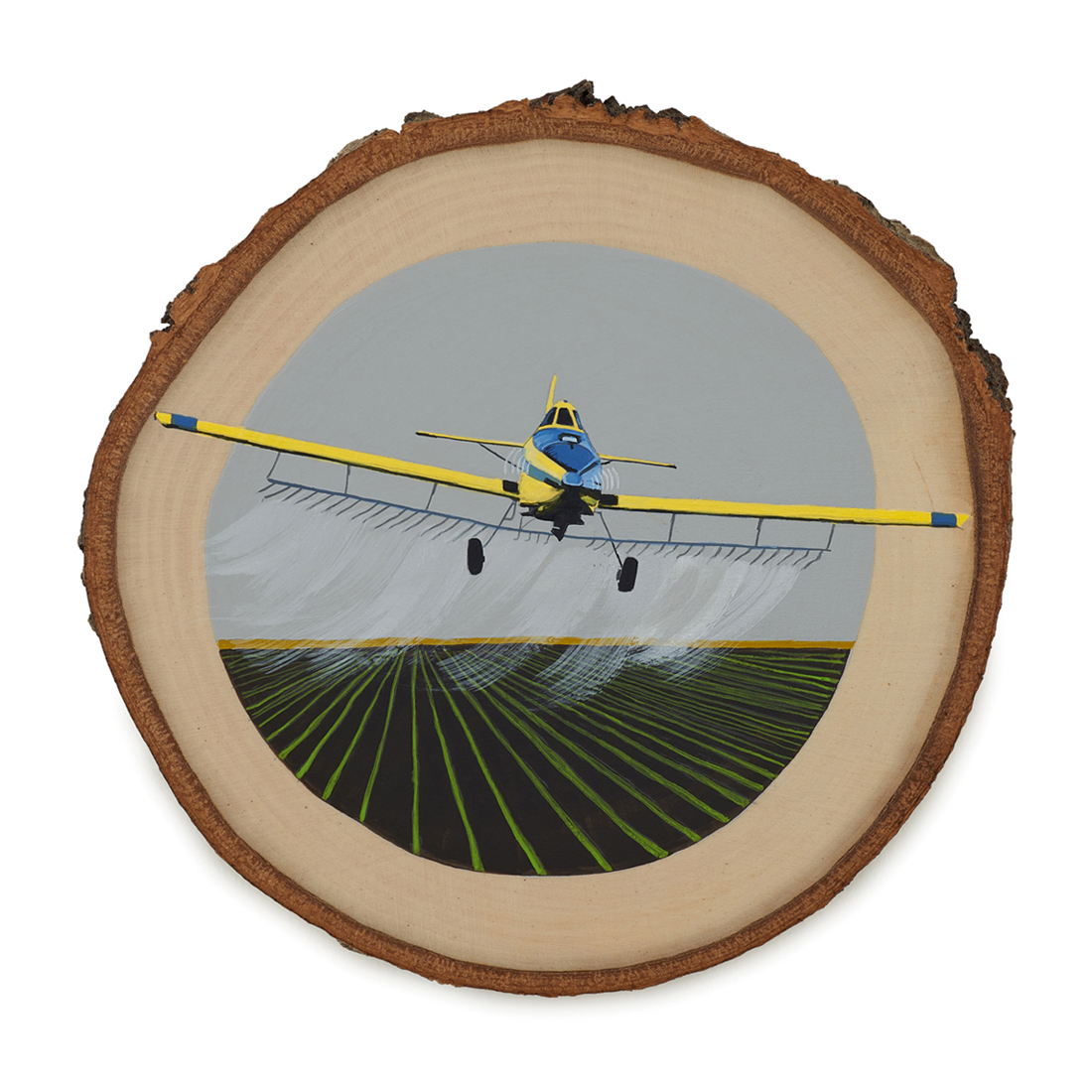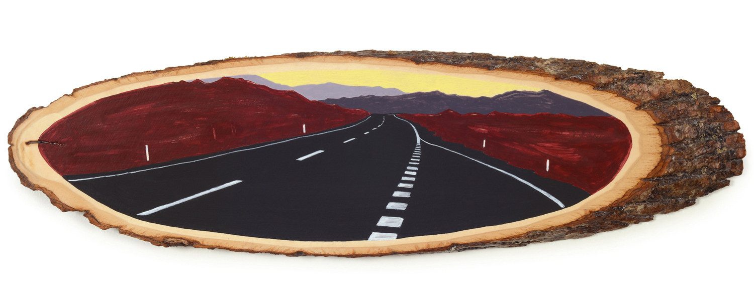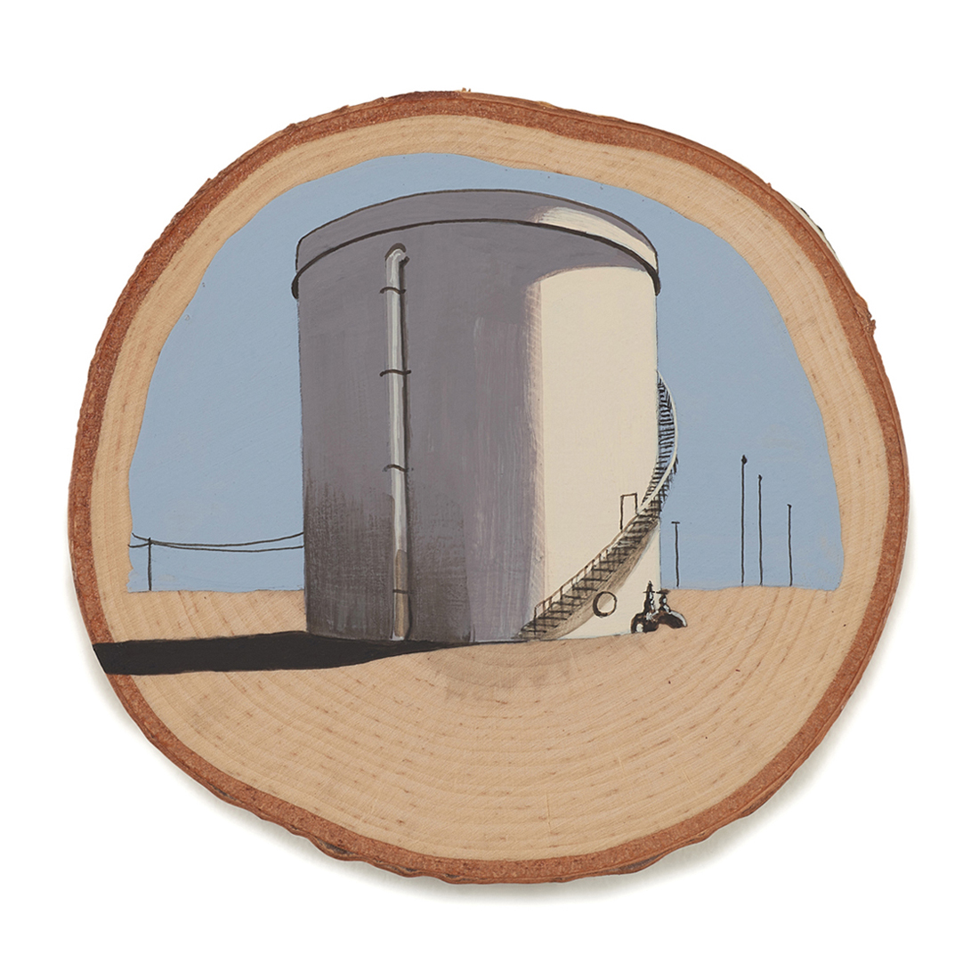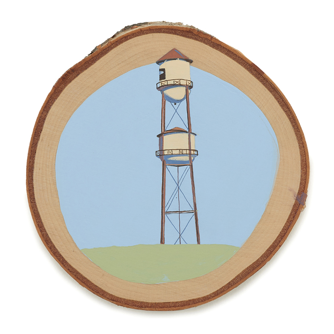The wood slice paintings are reminiscent of souvenirs travelers once purchased as mementos of their road trips. These “souvenir” portraits document life in rural California. They depict the agricultural, industrial and recreational landscape, as well as the wildlife whose habitats shrink as this landscape changes. The narrative that runs through these paintings is the story of my community.