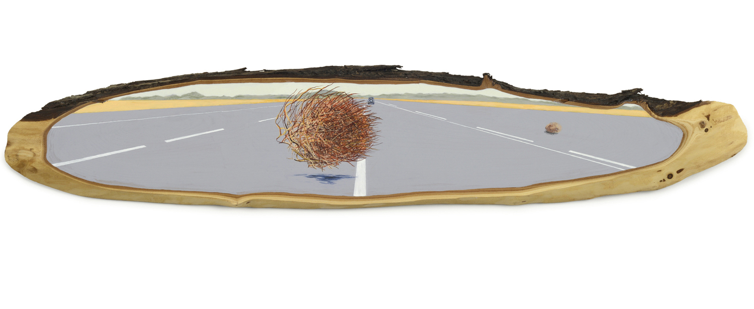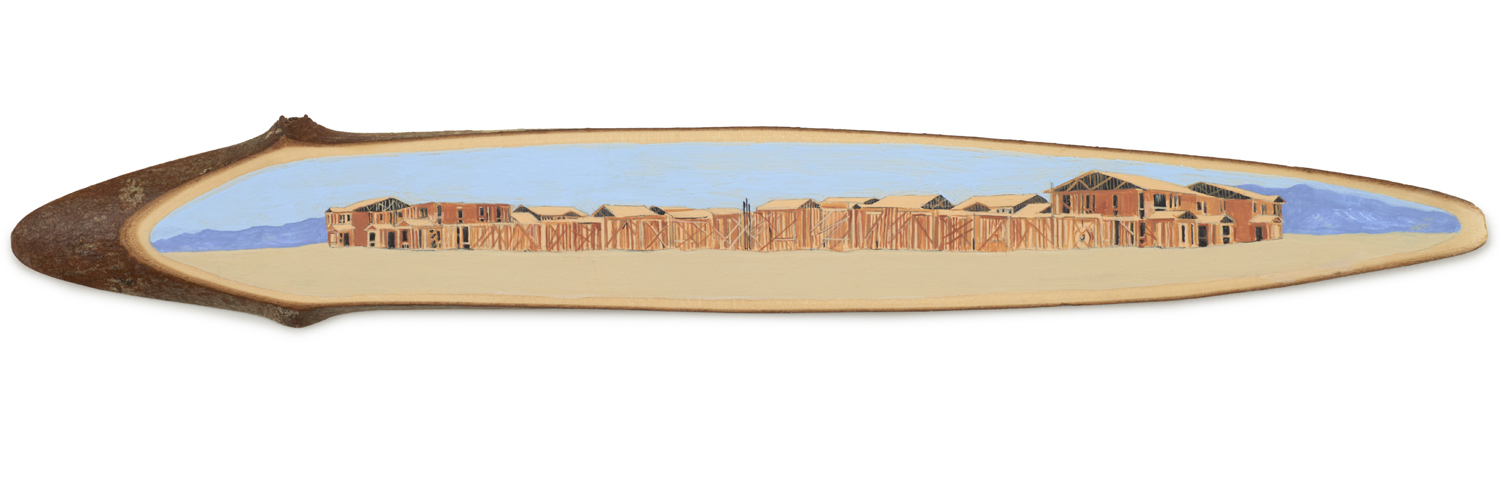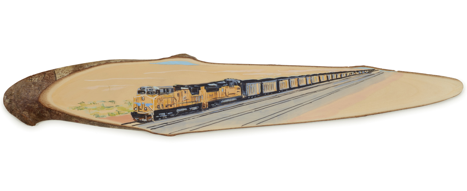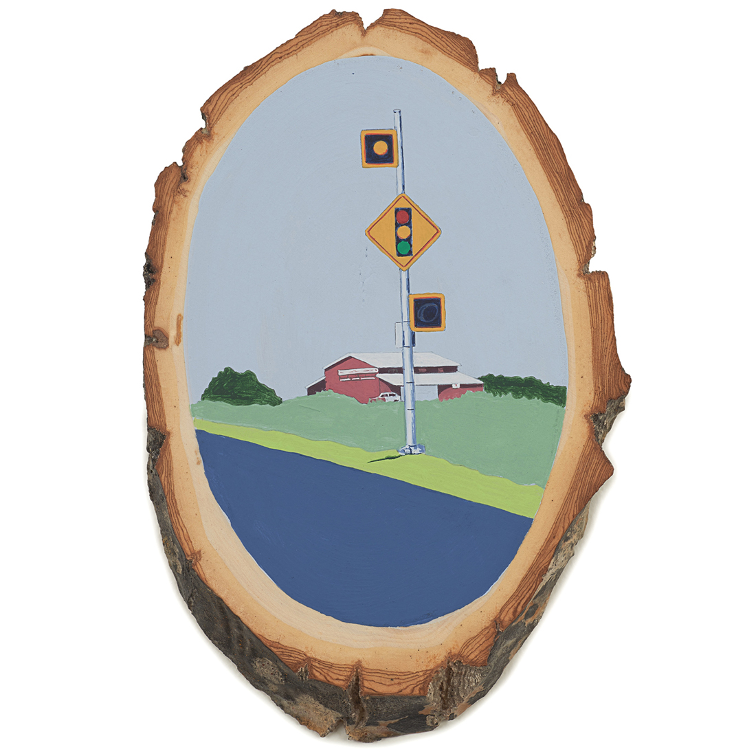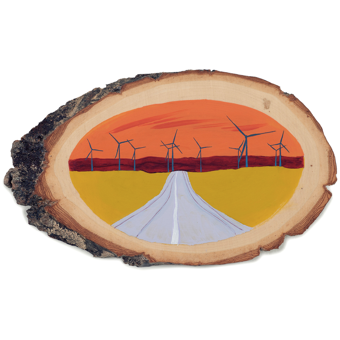 The wood slice paintings are reminiscent of souvenirs travelers once purchased as mementos of their road trips. These “souvenir” portraits document life in rural California. They depict the agricultural, industrial and recreational landscape, as well as the wildlife whose habitats shrink as this landscape changes. The narrative that runs through these paintings is the story of my community.
