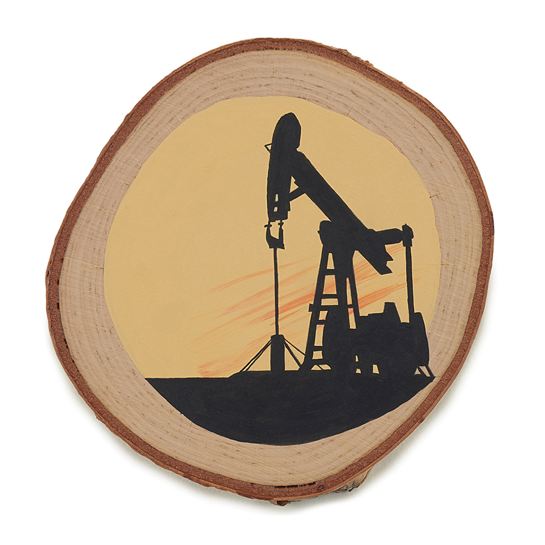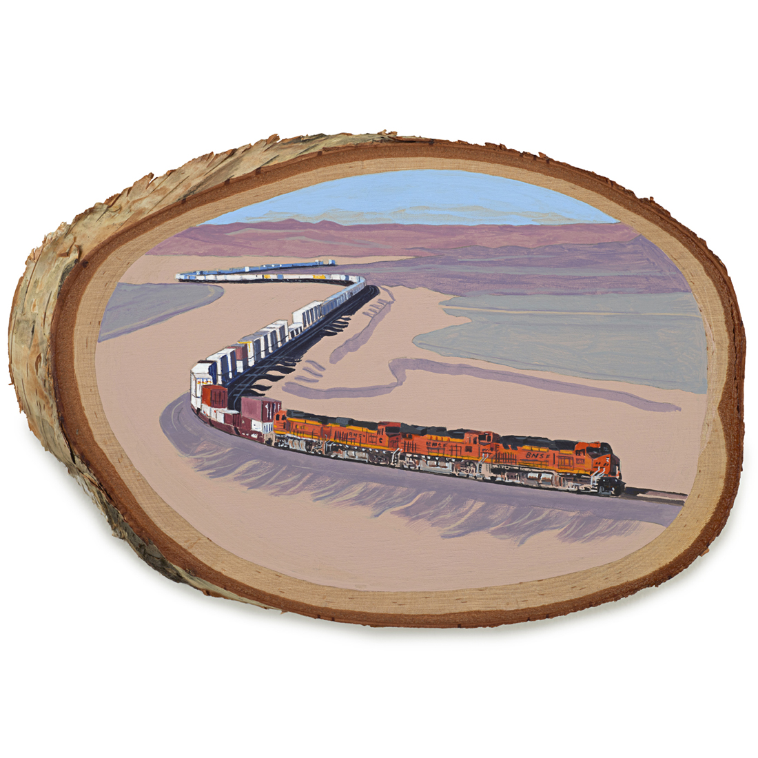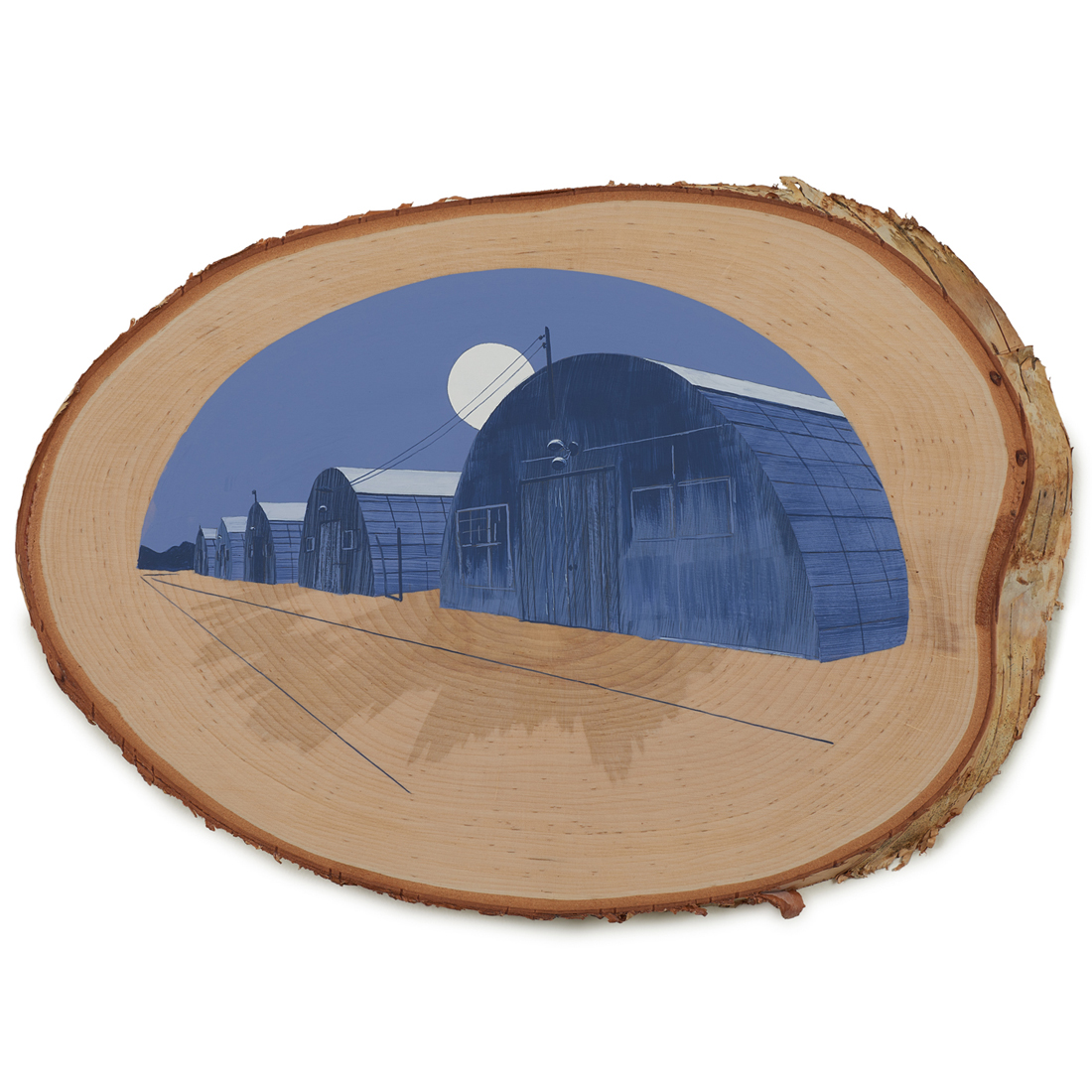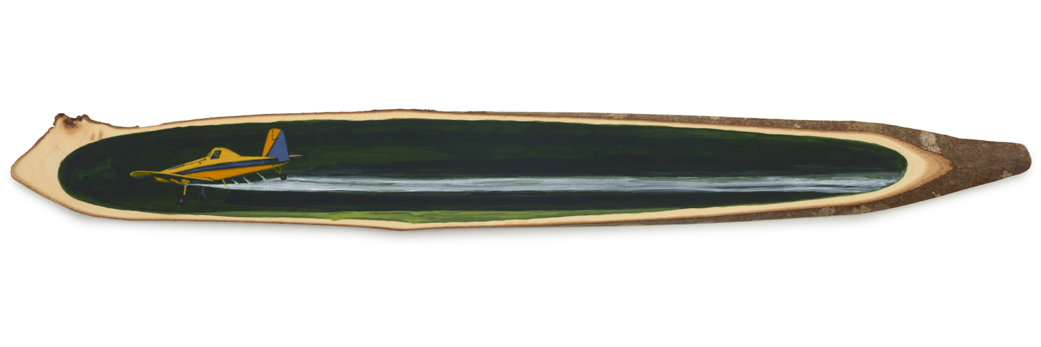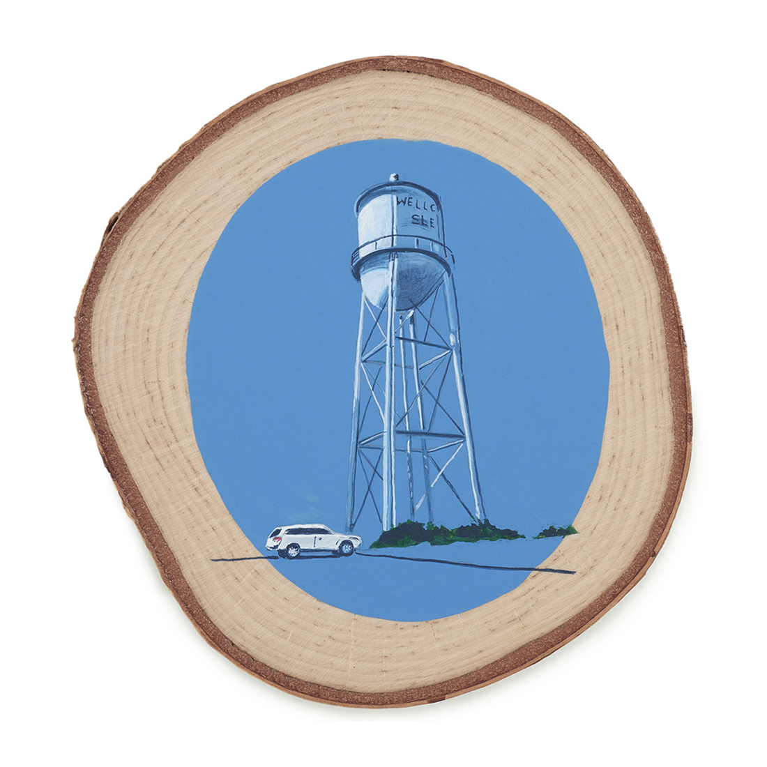 The wood slice paintings are reminiscent of souvenirs travelers once purchased as mementos of their road trips. These “souvenir” portraits document life in rural California. They depict the agricultural, industrial and recreational landscape, as well as the wildlife whose habitats shrink as this landscape changes. The narrative that runs through these paintings is the story of my community.