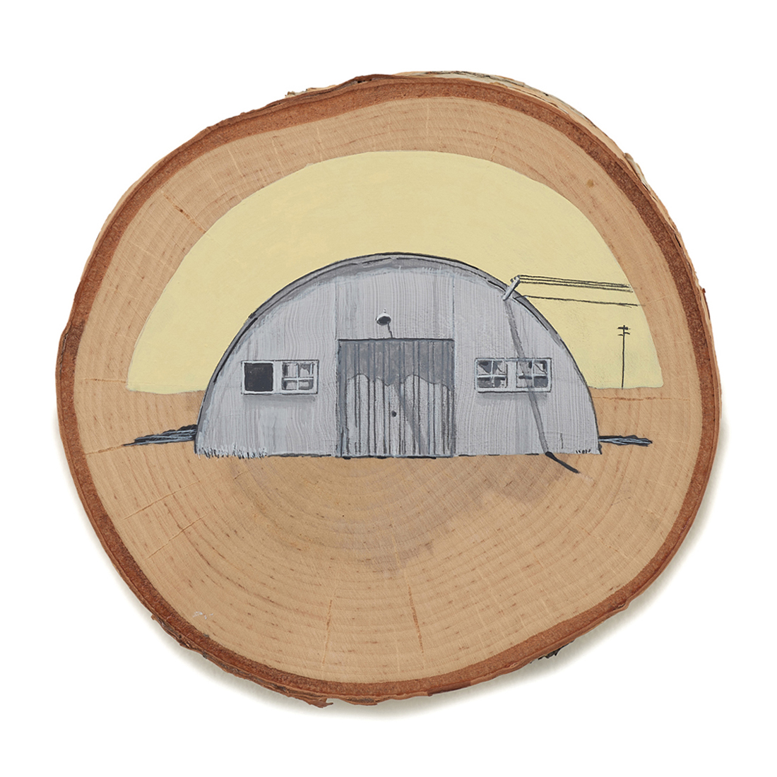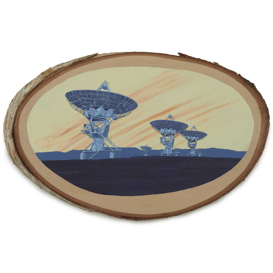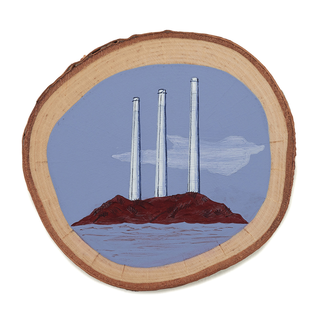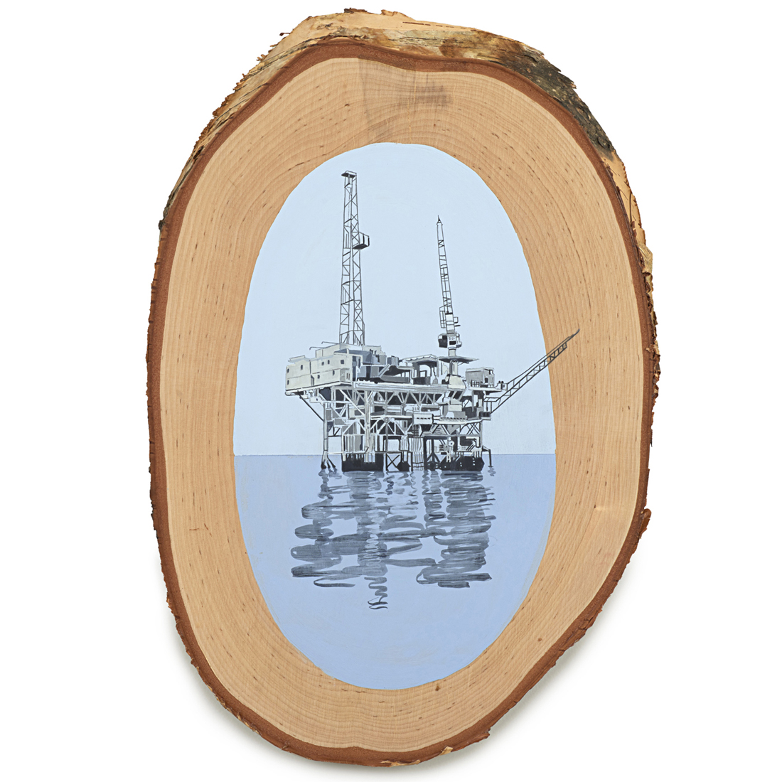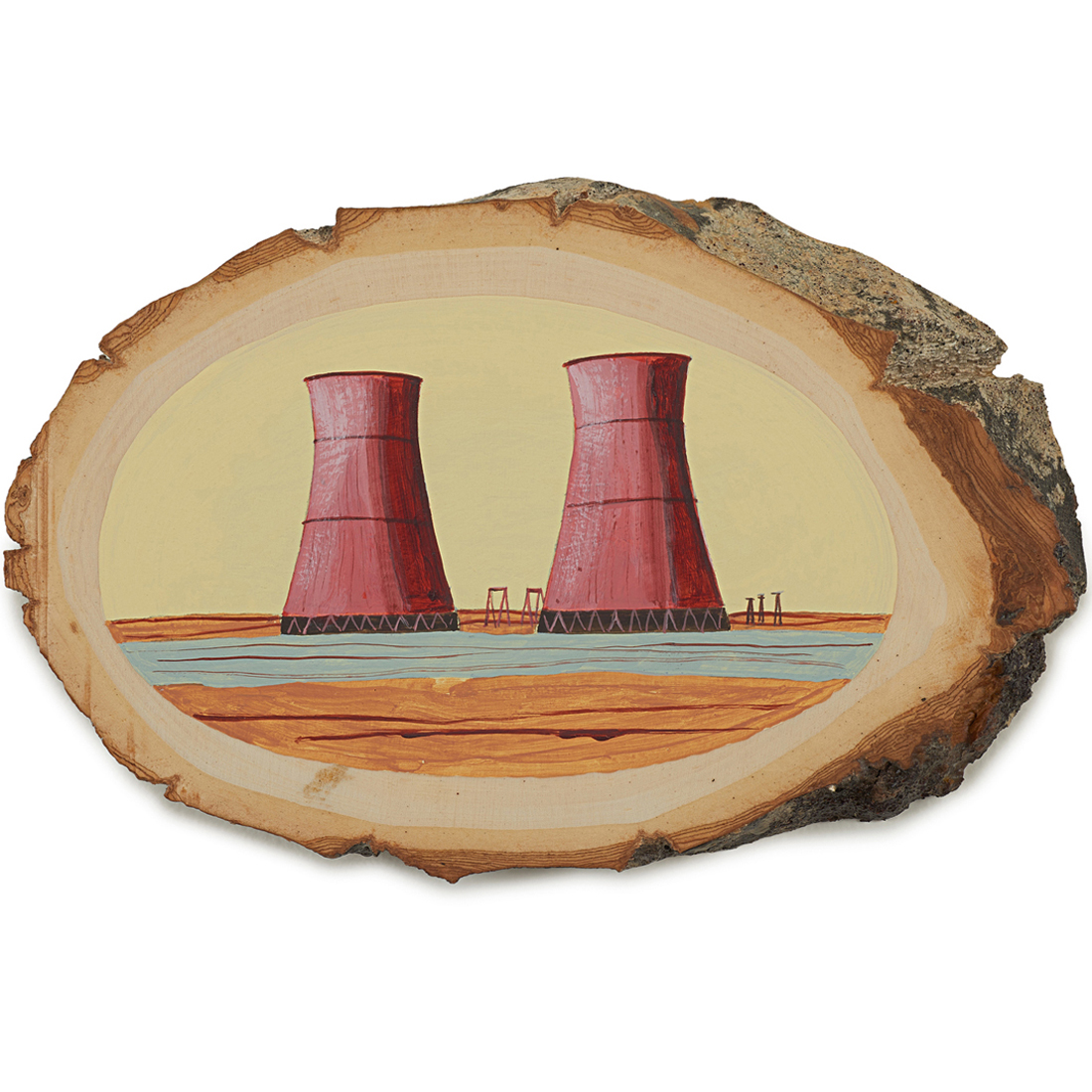 The wood slice paintings are reminiscent of souvenirs travelers once purchased as mementos of their road trips. These “souvenir” portraits document life in rural California. They depict the agricultural, industrial and recreational landscape, as well as the wildlife whose habitats shrink as this landscape changes. The narrative that runs through these paintings is the story of my community.