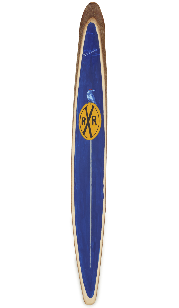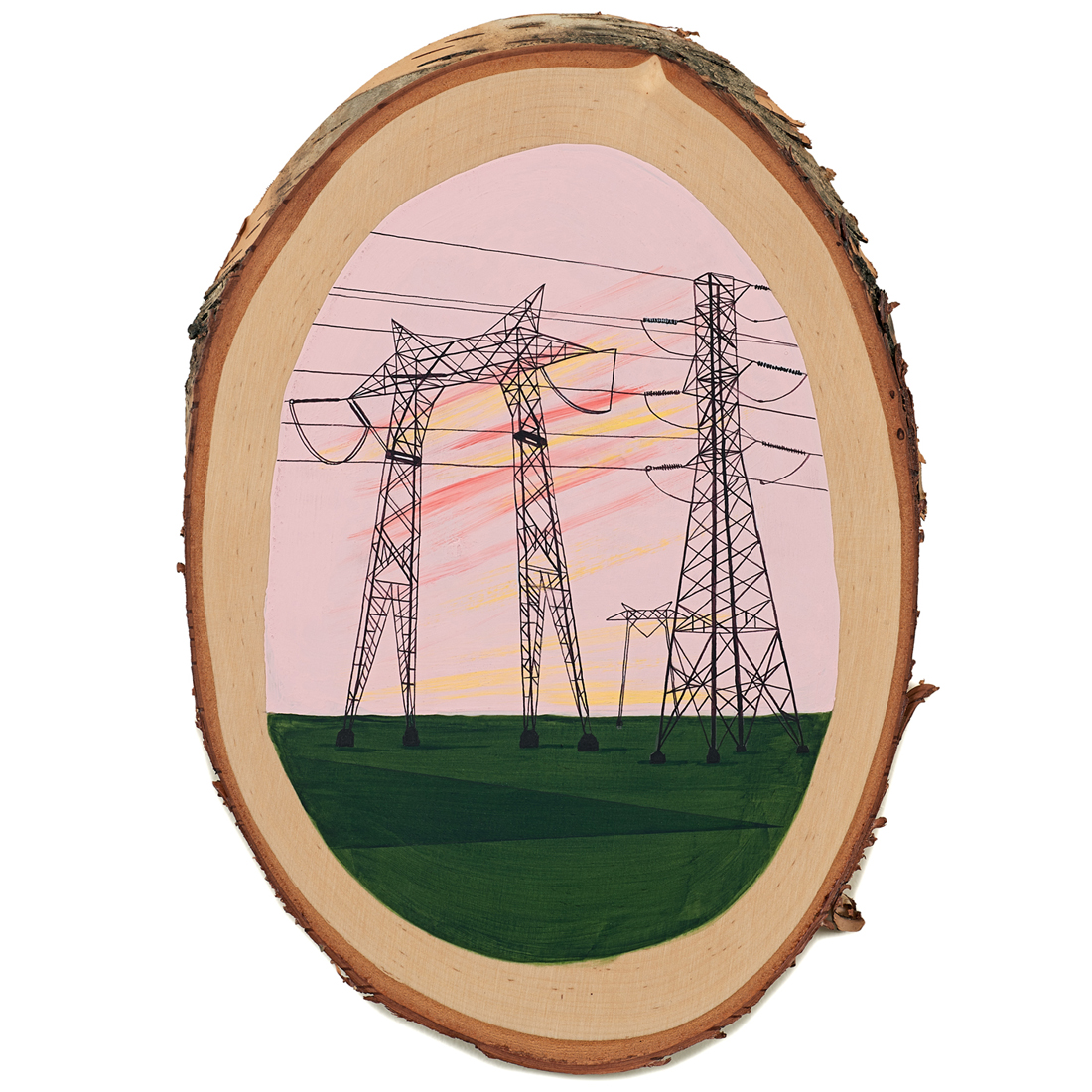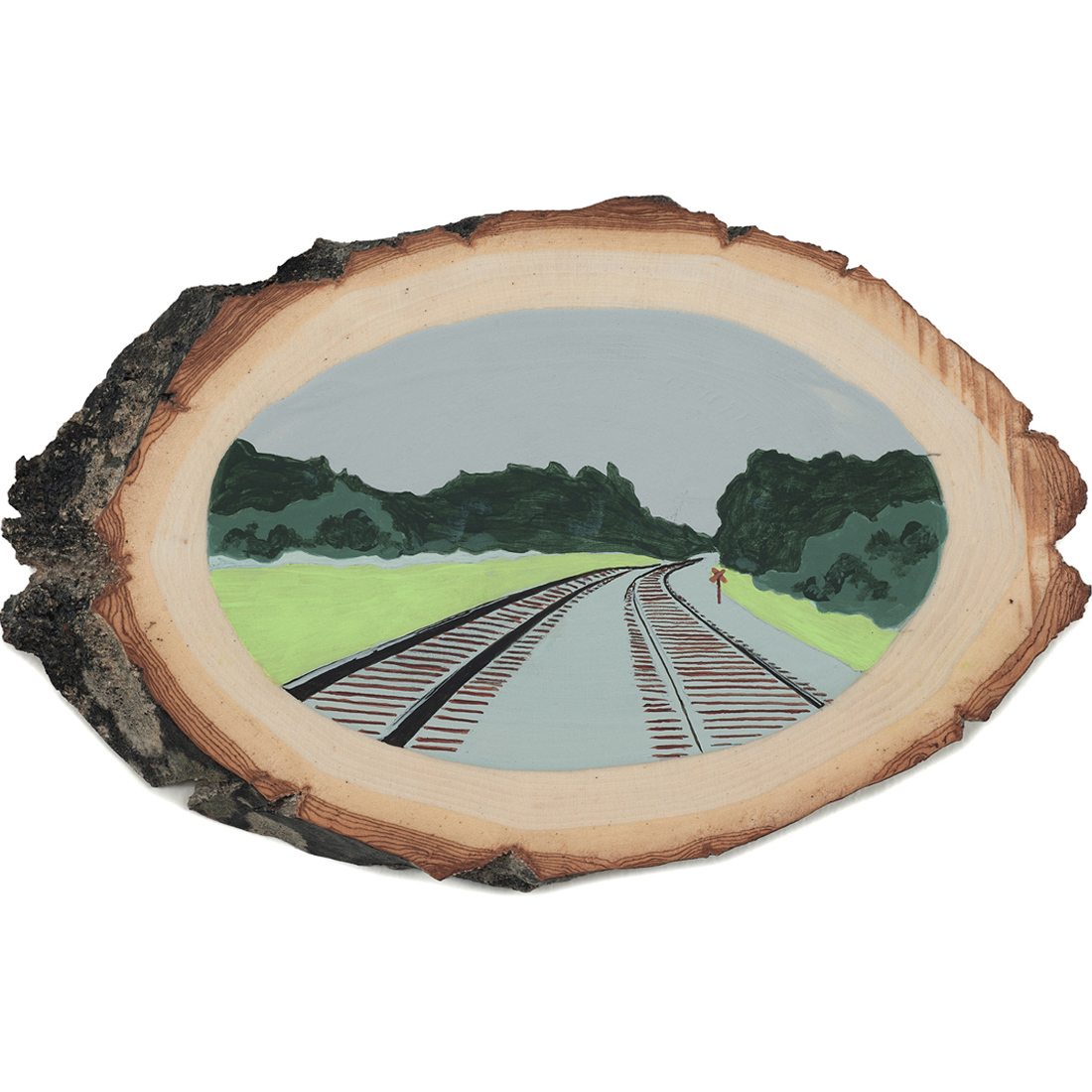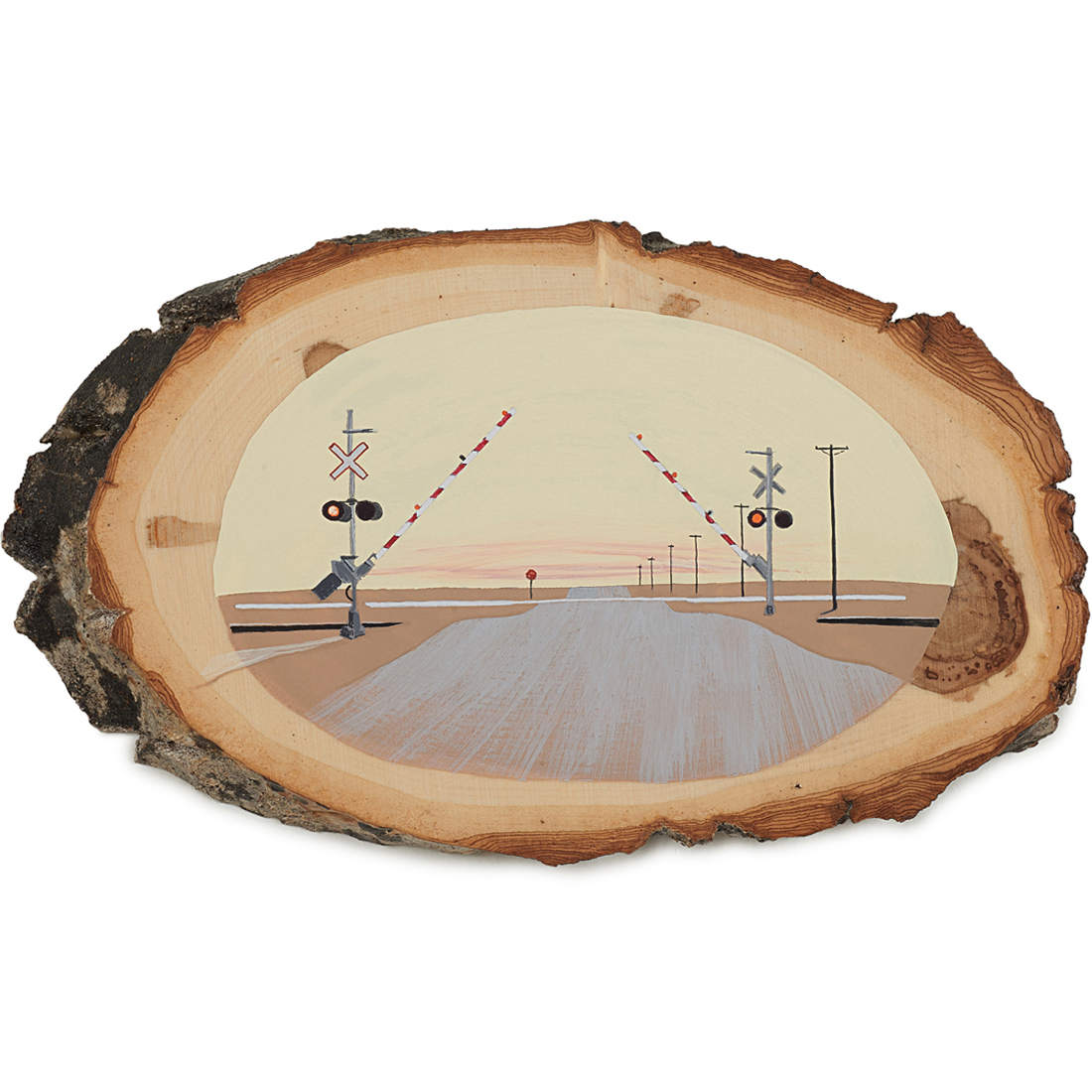 The wood slice paintings are reminiscent of souvenirs travelers once purchased as mementos of their road trips. These “souvenir” portraits document life in rural California. They depict the agricultural, industrial and recreational landscape, as well as the wildlife whose habitats shrink as this landscape changes. The narrative that runs through these paintings is the story of my community.